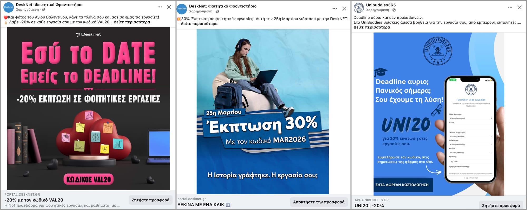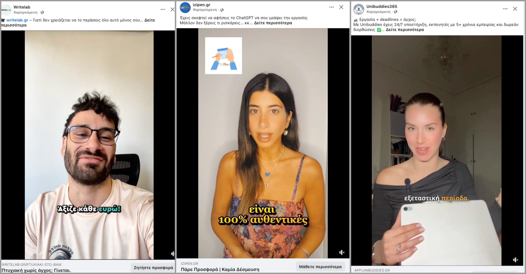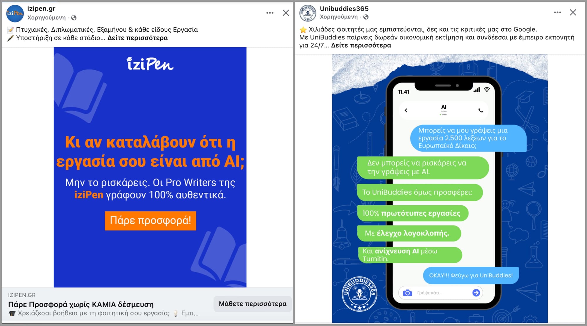 Στο πλαίσιο της έρευνας, εντόπισα περισσότερες από 25 ιστοσελίδες που προωθούν τις υπηρεσίες τους κυρίως μέσω Facebook, Instagram, και Tik Tok, ενημερώνοντας πως αναλαμβάνουν φοιτητικές εργασίες επ’ αμοιβή.