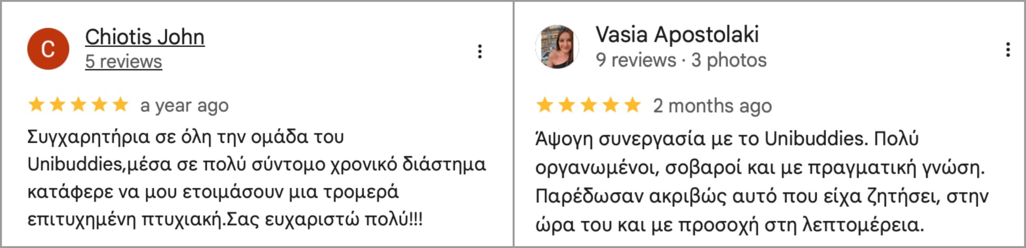 Η Unibuddies παρουσιάζει και τις θετικές κριτικές Google Reviews ευχαριστημένων πελατών, αλλά φροντίζει να ισορροπεί ως προς το πώς παρουσιάζει τις υπηρεσίες της: αλλού αναφέρεται πως η Unibuddies.gr υλοποιεί την εργασία, αλλού πως προσφέρει στήριξη.