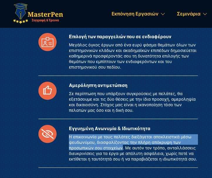 - Προσφορά 1ου Master Writer: 1000 ευρώ / Αριθμός εκπονηθέντων έργων στο πλαίσιο της συνεργασίας μας: 680 / Ακαδημαϊκό επίπεδο: Μεταπτυχιακό
