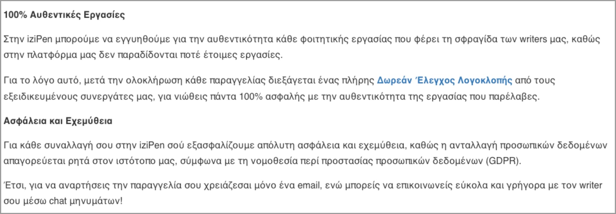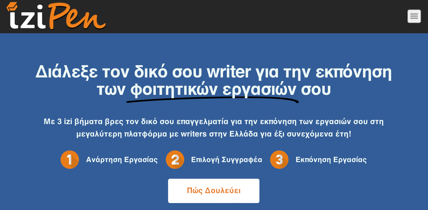 Αντίστοιχα, όταν μπαίνεις στην ιστοσελίδα τους, σε καλούν να διαλέξεις «τον δικό σου writer για την εκπόνηση των φοιτητικών εργασιών σου», και ενημερώνουν πως με «3 izi βήματα» μπορείς να βρεις «τον δικό σου επαγγελματία για την εκπόνηση των εργασιών σου στη μεγαλύτερη πλατφόρμα με writers στην Ελλάδα για έξι συνεχόμενα έτη!».