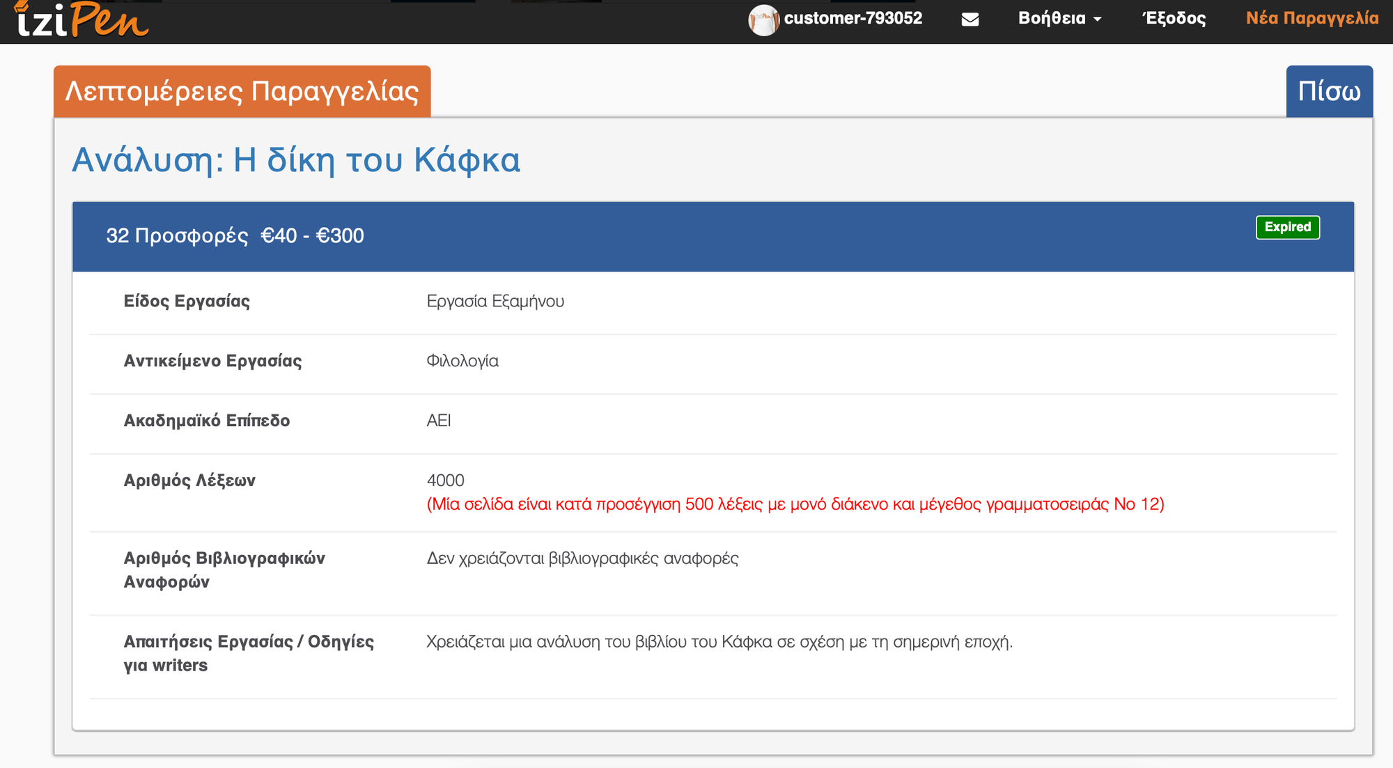 Το σύστημα εδώ δουλεύει διαφορετικά: ο πελάτης δεν επιλέγει τον εκπονητή. Αφού συμπλήρωσα τα σχετικά πεδία, την προσφορά μου έκανε το ίδιο το «γραφείο». Ζήτησαν 60 ευρώ και με ρώτησαν αν έχω το βιβλίο του Κάφκα ώστε να το μοιραστώ μαζί τους.