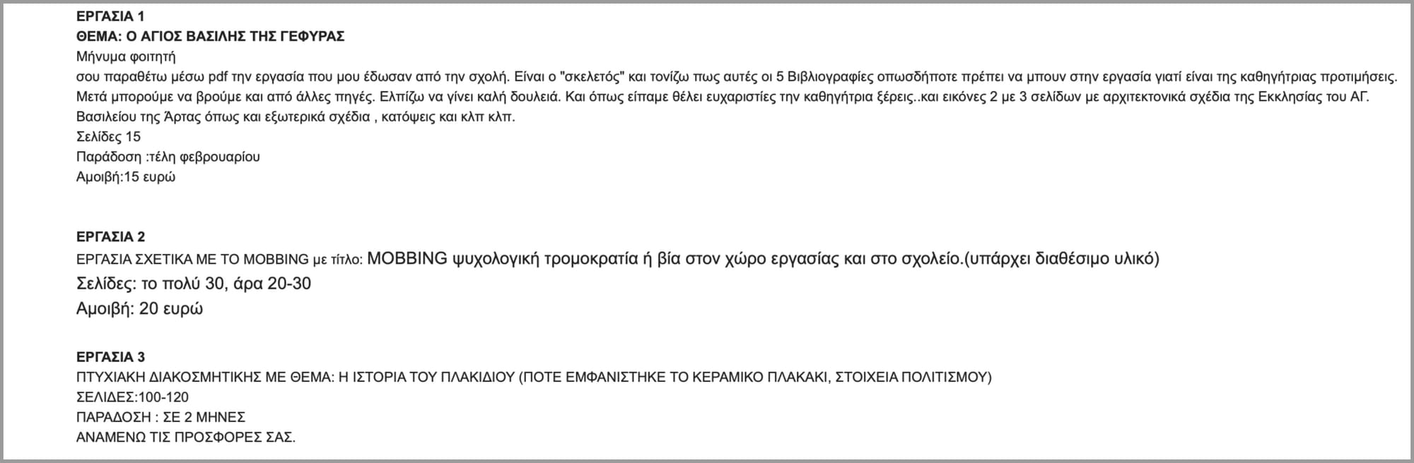 Έτσι, ήρθα σε επαφή με ένα προφίλ στο Facebook με όνομα Πτυχιακές Εργασίες και ξεκίνησα να δουλεύω μαζί τους. Με πρόσθεσαν σε μια λίστα, όπου σχεδόν καθημερινά έστελναν ένα email με τις διάφορες εργασίες που είχαν ως ανάθεση.