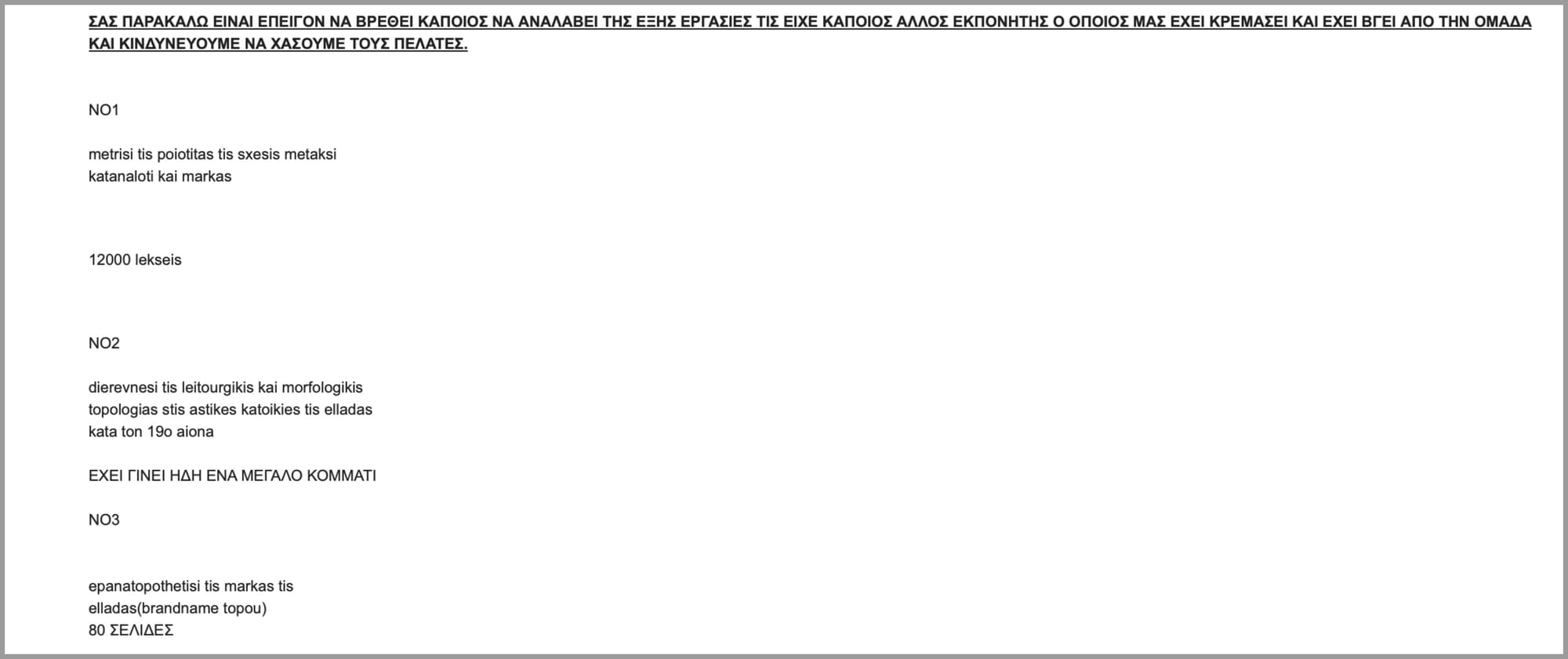 Με προθεσμία περίπου ενός μήνα, και έκταση 5.000 λέξεων, η προσφορά τους ήταν στα 80 ευρώ.