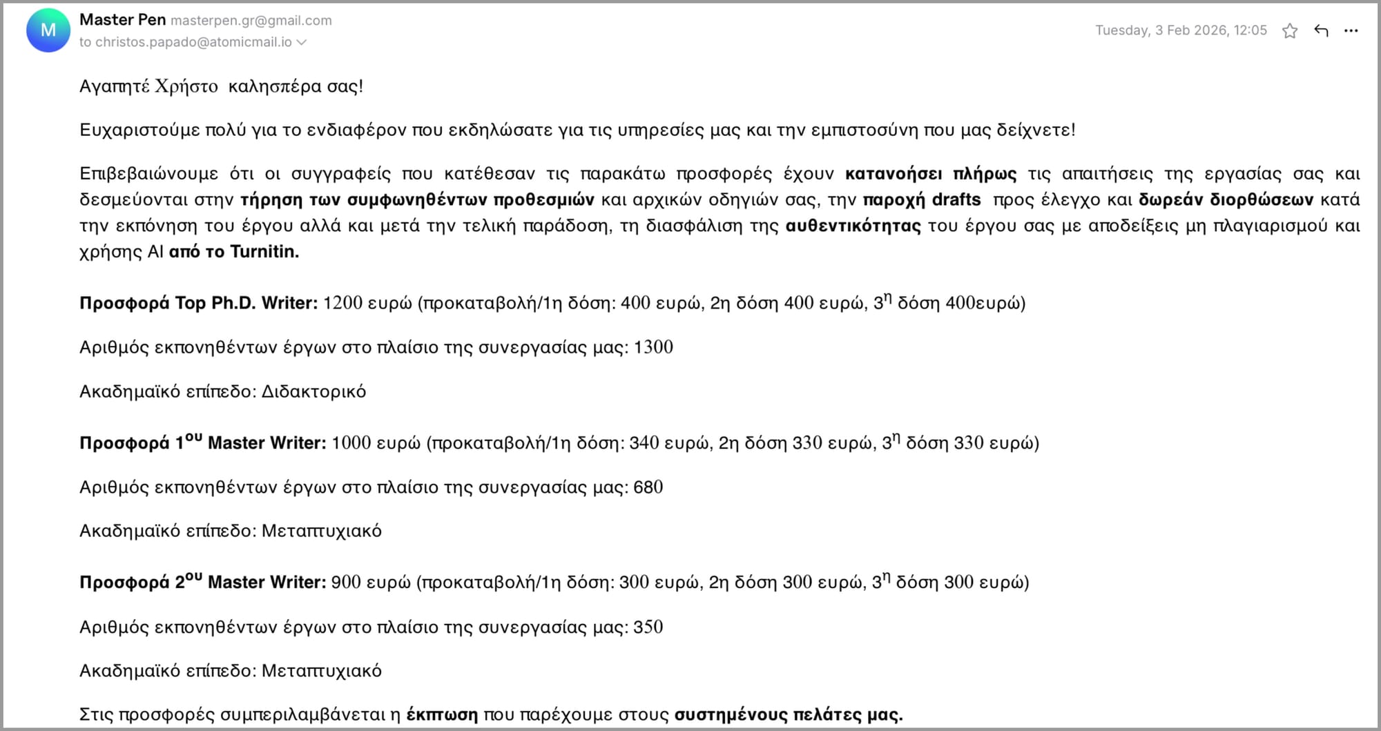 Δηλαδή, οκέι, φαντάζομαι πως στην Ελλάδα σήμερα θα υπάρχουν αρκετοί Σπύροι Παπαδόπουλοι. Εννοώ, όμως, πως έφτιαξα το συγκεκριμένο email στο πλαίσιο μιας έρευνας που έτρεξα τα τελευταία δύο χρόνια, η οποία εξετάζει τη βιομηχανία φοιτητικών εργασιών στην Ελλάδα.